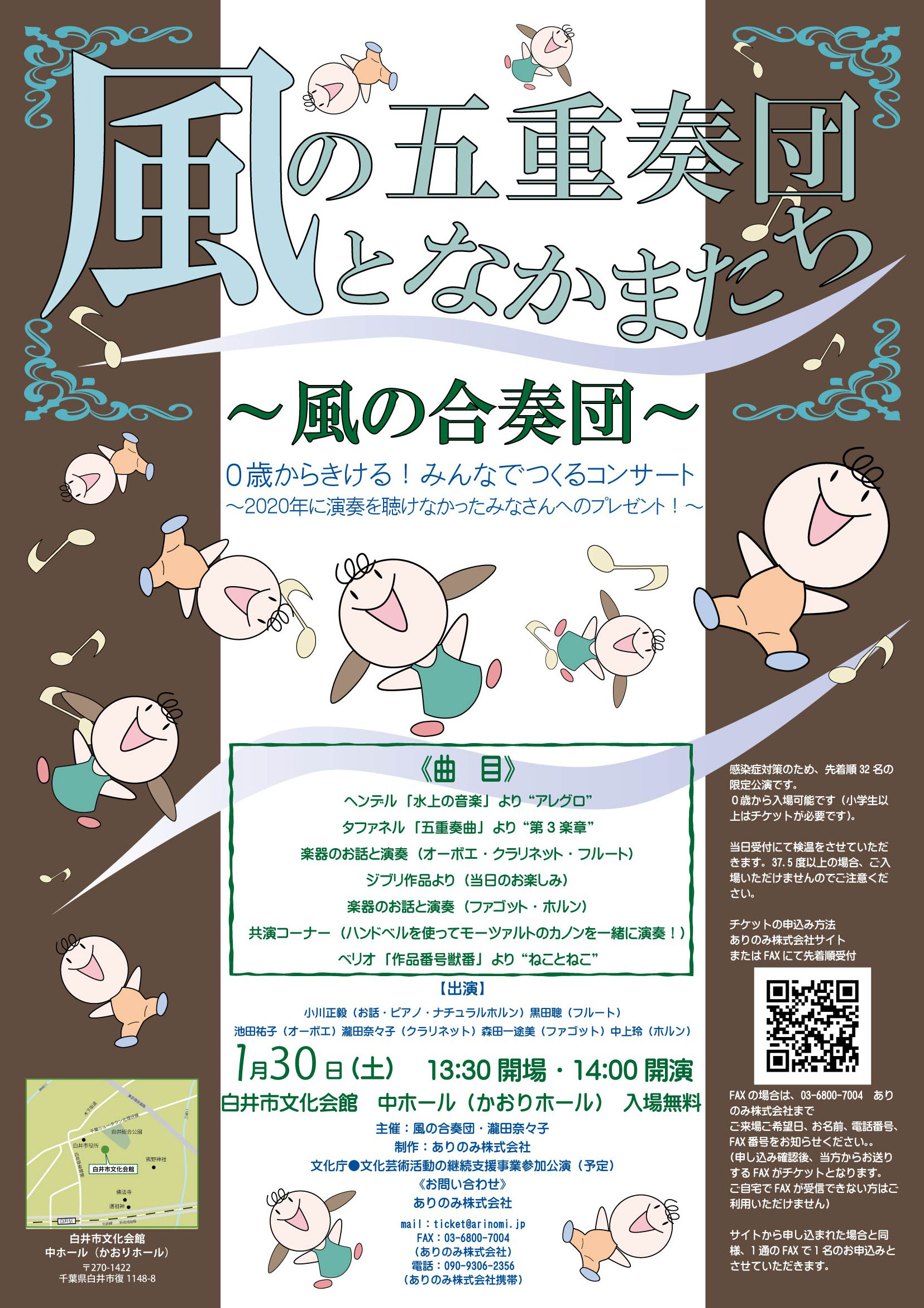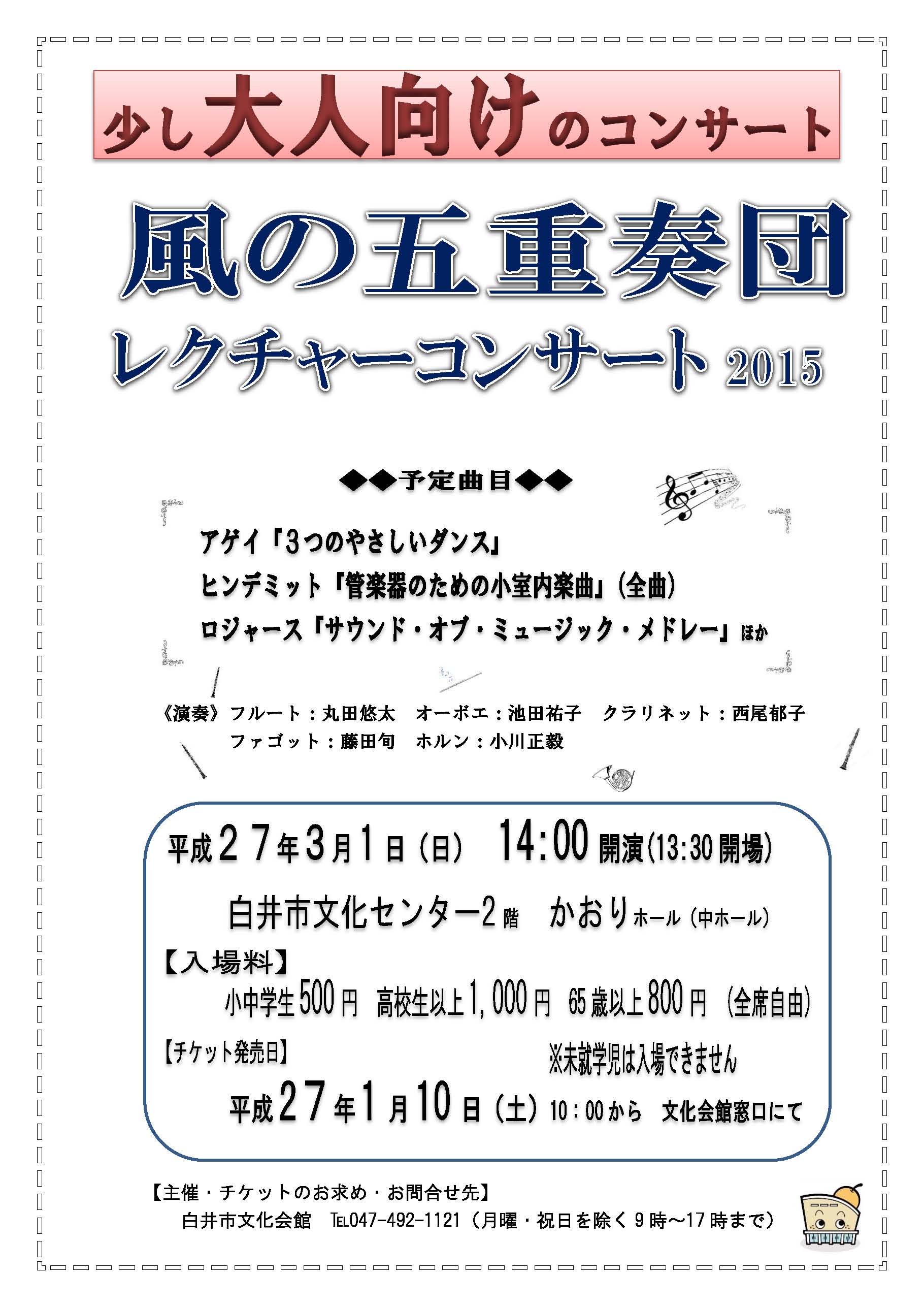 2021/1/30白井市文化会館・中ホール(かおりホール)“風の合奏団”〜“風の五重奏団”となかまたち〜みんなでつくるコンサート(白井公演。入場無料。先着順32名)チケット