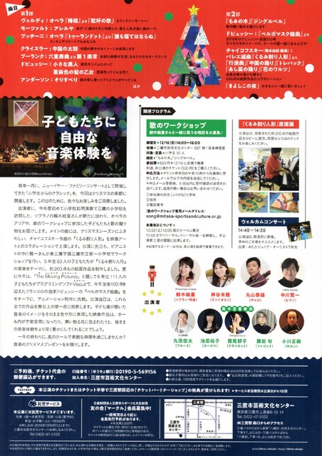 その他にも、本格的なオペラのアリアやクラシックの小品、昨年も好評だったソプラノの鵜木絵里さんと歌のワークショップに参加した子どもたちによるクリスマスソング、木管五重奏によるジブリ映画音楽特集などご家族で楽しめるプログラムです。
